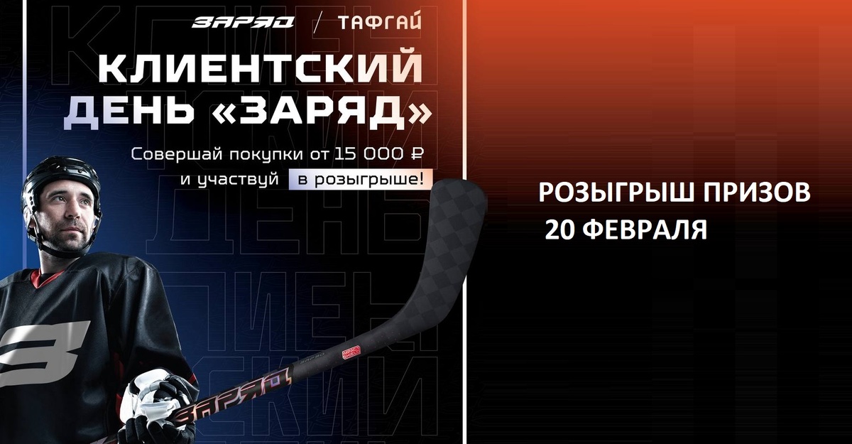 Выиграй клюшку и другие призы от бренда "ЗАРЯД" в магазине "ТАФГАЙ" Приходи с 19 января по 20 февраля в «ТАФГАЙ» и участвуй в акции от бренда «ЗаряД». 📍 Акция проходит во всех магазинах "ТАФГАЙ". 🎁 Призы: 🥇 1 МЕСТО: Игровая клюшка APEX [PRO] - оружие для настоящих побед. 🥈 2 МЕСТО: Сувенирная клюшка в эксклюзивном дизайне «Россия» - хоккейный символ для коллекции. 🥉 3 МЕСТО: Шайба с автографом легенды - Даниса Зарипова. 📌 Как принять участие: 1️⃣ Совершите покупку в магазине «ТАФГАЙ» на сумму от 15 000 ₽ 2️⃣ Получите купон участника на кассе 3️⃣Опустите отрывную часть купона в специальный лототрон в магазине. 4️⃣Приходите на розыгрыш 20 февраля в 18:30 - итоги подведём во всех магазинах 📅 Сроки акции: 19.01.2026 - 20.02.2026 🔥 Покупаешь то, что нужно - получаешь шанс на то, о чём мечтаешь. Если давно планировал серьёзное обновление - это идеальный момент. ТАФГАЙ. Мы рядом, когда важен результат - на льду и за его пределами.