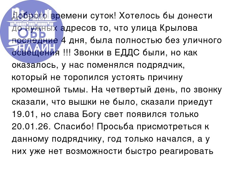 !!! Звонки в ЕДДС были, но как оказалось, у нас поменялся подрядчик, который не торопился устоять причину кромешной тьмы. На четвертый день, по звонку сказали, что вышки не было, сказали приедут 19.01, но слава Богу свет появился только 20.01.26. Спасибо! Просьба присмотреться к данному подрядчику, год только начался, а у них уже нет возможности быстро реагировать на проблемы, раньше такого не было! Всех с прошедшими праздниками! vk.ru Подробнее на https://vk.com/ob.gorod #городобь #городобьонлайн #толмачево
