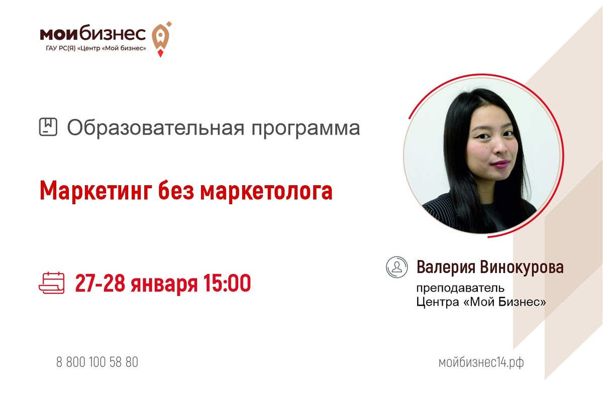 ». 🌟Программа предназначена для предпринимателей, самозанятых и руководителей, которые хотят освоить основы маркетинга и его инструменты для самостоятельного продвижения своего бизнеса, чтобы эффективно привлекать клиентов без найма специалиста, фокусируясь на базовых практических шагах и современных подходах. ⚡️В программе: - Основы современного маркетинга; - Изучение эффективных маркетинговых инструментов в бизнесе; - Что обязательно нужно сделать перед запуском рекламы? - Стратегия бизнеса без посторонней помощи. 📆Дата: 27- 28 января 2026 г. ⏰Время: с 15:00 ч. ✔️Формат обучения: онлайн. ✔️Участие бесплатное. 🎙Спикер: Валерия Винокурова, преподаватель Центра «Мой Бизнес». 🔗Регистрация по ссылке: https://forms.yandex.ru/cloud/696f3e92eb6146bec22a2b21 Развивайте бизнес с нами! 📲Напоминаем, что канал Центра "Мой бизнес" запущен в МАХе. Подпишитесь, чтобы оставаться в курсе последних новостей! @moibizsakha