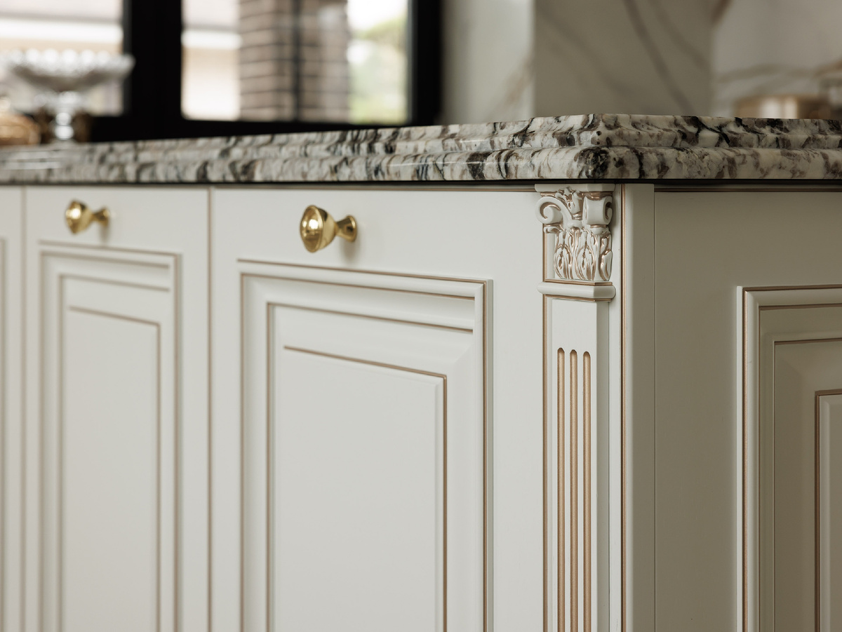 Фасады этой кухни выполнены сборными — они собраны из отдельных элементов, а не сформированы фрезеровкой из цельной плиты. Это принципиальный момент для классической мебели: такая конструкция даёт правильную глубину, живую тень и архитектурную пластику, которая со временем не теряет выразительности. Резные детали выполнены с последующей ручной доработкой. Именно она убирает ощущение «тиражности» и придаёт орнаменту мягкость и благородство, которые невозможно получить только машинной обработкой. Фурнитура подбиралась как часть общей композиции — по пропорциям, оттенку металла и характеру формы. Патинирование нанесено деликатно: оно не утяжеляет фасады, а подчёркивает профиль, усиливает рельеф и визуальный объём, работая в связке с лепниной и декоративными элементами интерьера. В результате детали не спорят между собой и не выходят на первый план — они формируют цельный, выверенный образ классической кухни, где каждая линия имеет значение.