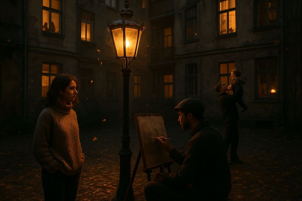 Прошло пять лет. Ранняя осень. Воздух пахнет прелыми листьями и дымком из печных труб. Двор, обновлённый, но узнаваемый, пуст. Только у фонаря стоит молодой человек с мольбертом. Он сосредоточенно смешивает краски на палитре, пытаясь поймать точный оттенок вечернего света на тёмном металле.