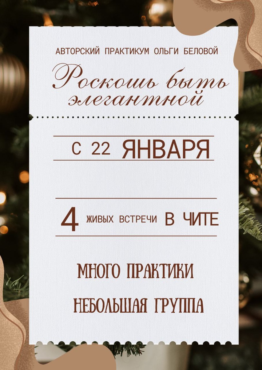 Практикум от дипломированного кинетика "Роскошь быть элегантной" Организаторы обещают четыре занятия раз в неделю на следующие темы: базовые принципы невербалики для элегантности движений, царственная осанка, красивая женственная походка и элегантные позы. 🕐22 и 29 января, 5 и 12 февраля,в 18.45 🪙 12 000 рублей 🔑забронировать участие @OlgaBelovaLoveLife #Новости Предложить публикацию:@zabkulisye_bot