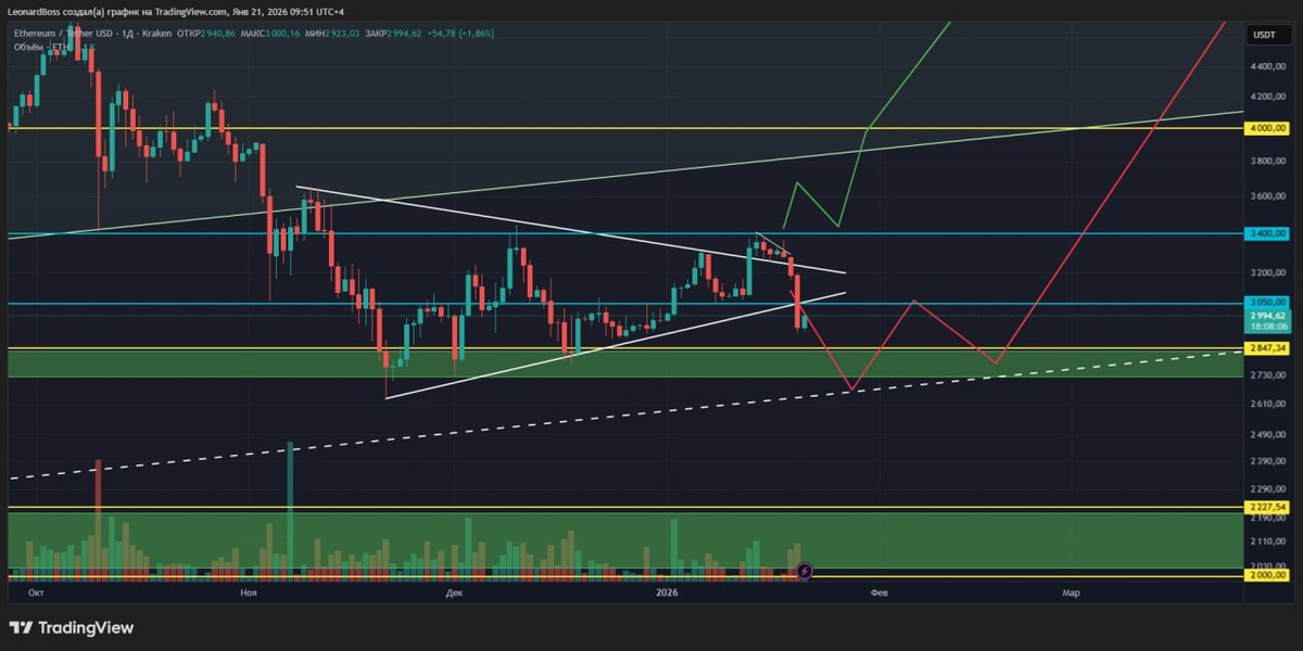 #мнениепорынку ☄️☄️☄️ #ETH = #Альты = ‼️Вы всё знали‼️ ⚠️Читайте коллеги, прикрепленный пост = последний пункт с молнией☄️ о противоречиях! Там всё расписано подробно, чего ждать и при каких триггерах. Если вы умеете не спешить, то в принципе могли наблюдать отличную отработку сценария!! ❓ Чего ждать в текущем положении и что нам говорят два основных указателя дальнейшего движения рынка, BTC and ETH?? 1️⃣ ETH, начну с него, глядя на прежнюю разметку: снизу всё тот же блок и уровень 2800, который исторически себя показывал неоднократно с обеих сторон. Там же, чуть ниже средняя линия дочернего канала, которая является мощным притяжением цены. Соответственно, имеем на горизонте сильнейшую поддержку, если (когда) она не справится с давлением = нас ждет сильнейшее снижение, где повториться осенний импульс снижения, который сегодня (в очередной раз) кажется невероятным!! 🔤 BTC, второй график, также вам известный с наличием медвежьего паттерна. Получили выход цены вниз с пробоем нижней