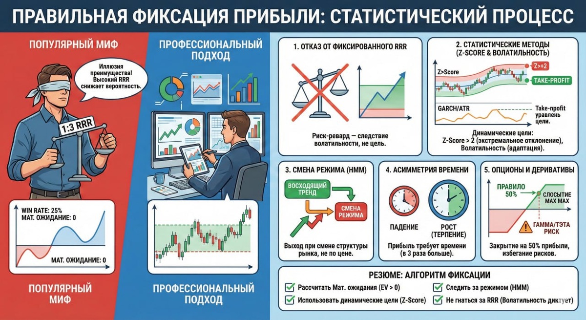 Правильная фиксация прибыли и выставление тейк-профитов, — это не попытка угадать вершину рынка, а статистический процесс управления вероятностями. Профессиональный подход кардинально отличается от популярных советов о фиксированном соотношении риска к прибыли. Опираясь на источники, можно выделить следующие принципы эффективного закрытия позиций: 1️⃣ Отказ от фиксированного соотношения Риск/Прибыль (RRR) Популярный совет «всегда искать сделки с соотношением 1:3» (риск 1, прибыль 3) часто является математической ловушкой. 🔹 Иллюзия преимущества: Само по себе высокое соотношение RRR не создает рыночного преимущества (edge). Согласно теории первого времени прохождения для случайных блужданий, чем выше вы ставите тейк-профит относительно стопа, тем пропорционально ниже становится ваш Win Rate (процент побед). При RRR 3:1 теоретическая вероятность успеха падает до 25%, что дает нулевое математическое ожидание. 🔹 Реальный подход: Профессиональные трейдеры не подгоняют рынок под желае