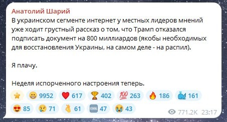Попкорн не употребляю, но пару сладких косточек заготовил, думал, буду грызть их в углу, наблюдая за тем, как угорает хозяин, глядя на эту свару вселенскую. Наблюдающий за наблюдающими, так сказать. Украинчики, миленькие! Ну вы как дети, в самом деле. Ну кто ж вам в здравом уме даст 800 лярдов? Даже просто поглядеть-понюхать? Ведь знают прекрасно, что даже просто после "поглядеть-понюхать" там уже половины не будет. 🐶 Подпишись на Шарика! Гав!