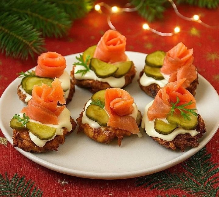 Бюджетная, эффектная и очень вкусная закуска из простых ингредиентов ИНГРЕДИЕНТЫ: ОСНОВА (ДРАНИКИ): ✅ Картофель — 1 крупный ✅ Яйцо — 1 шт. ✅ Мука — 2 ст. л. ✅ Соль — по вкусу ✅ Чёрный молотый перец — по вкусу ✅ Растительное масло — для жарки НАЧИНКА И ПОДАЧА: ✅ Красная рыба (солёная или слабосолёная) — 150–200 г ✅ Солёный огурец — 1 шт. ✅ Творожный сыр — по вкусу ✅ Зелень — для украшения ПРИГОТОВЛЕНИЕ: 1. Картофель очистить, натереть на крупной тёрке и тщательно отжать сок. 2. Добавить яйцо, соль, чёрный перец и муку. Хорошо перемешать до однородной массы. 3. На сковороде разогреть достаточное количество растительного масла. Выложить картофельную массу ложкой, формируя небольшие драники. 4. Обжарить на среднем огне по 3–4 минуты с каждой стороны до золотистой корочки. 5. Готовые драники выложить на бумажное полотенце, чтобы убрать излишки масла, затем переложить на блюдо для подачи. 6. Каждый драник смазать слоем творожного сыра. 7. Красную рыбу свернуть в виде розочки и выл