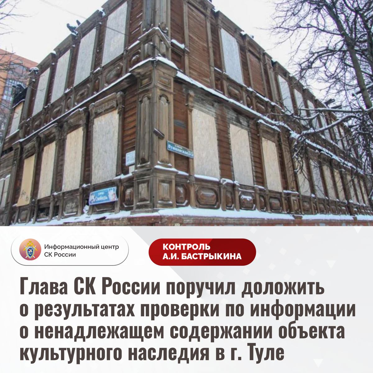 Глава СК России поручил доложить о результатах проверки по информации о ненадлежащем содержании объекта культурного наследия в г. Туле В СМИ сообщается о ненадлежащем содержании объекта культурного наследия регионального значения «Жилой дом с флигелем Н.П. Страхова» в городе Туле. Конструкции здания, возведенного в конце 19 - начале 20 веков, разрушаются, в помещениях неоднократно происходили возгорания, в связи с чем в 2014 году оно признано аварийным, а жильцы расселены. Несмотря на наличие вступившего в законную силу судебного решения, до настоящего времени работы по консервации и реставрации строения не проведены. В СУ СК России по Тульской области организована процессуальная проверка. Председатель Следственного комитета Российской Федерации Александр Иванович Бастрыкин поручил руководителю СУ СК России по Тульской области Владимиру Владимировичу Усову доложить о промежуточных результатах процессуальной проверки и принятом по итогам решении. Исполнение поручения, а также ход процес
