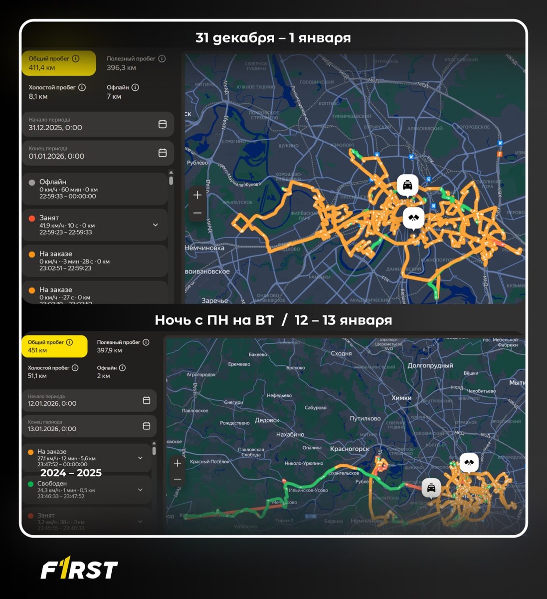 Мы созвонились с Александром, и он подтвердил информацию, которую я вам ранее присылал о его формате работы. Я всё напомню, но сначала цифры: Выручка: 842 765 ₽ Из них наличка: 223 040 ₽ Комиссии: 296 356 ₽ Налог: 33 611 ₽ Время на линии: 390 часов, 28 дней, с 18-19 часов вечера до 9-11 часов утра. Работает по 12-16 часов в день с перерывом ночью в будни часа три Авто: Geely Coolray, 3 200 ₽/сутки или 89 600 ₽ за всю гонку Пробег: 10 800 км примерно, в среднем по 400 км в сутки, в пути с клиентом 7 630 км Бензин: Берём 15 литров на сотку, итого 111 000 ₽ Мойка: Возьмем 2 раза в неделю по 1500 ₽, итого 12 000 ₽ Тариф: Комфорт+Эконом в режиме "Мой район" по центру Москвы в основном Доход в час по Яндексу: 1519 ₽ (Выручка минус комиссия Яндекса) Штрафы: 4725 ₽, 7 штук за превышение Как и всегда, я не считаю лекарства, еду и т.д. Это всё индивидуально и нужно на любой работе. 💸 Итого, чистая прибыль за гонку: 300 000 ₽ Ну а теперь комментарии и ответы на мои вопросы от самого Алексан