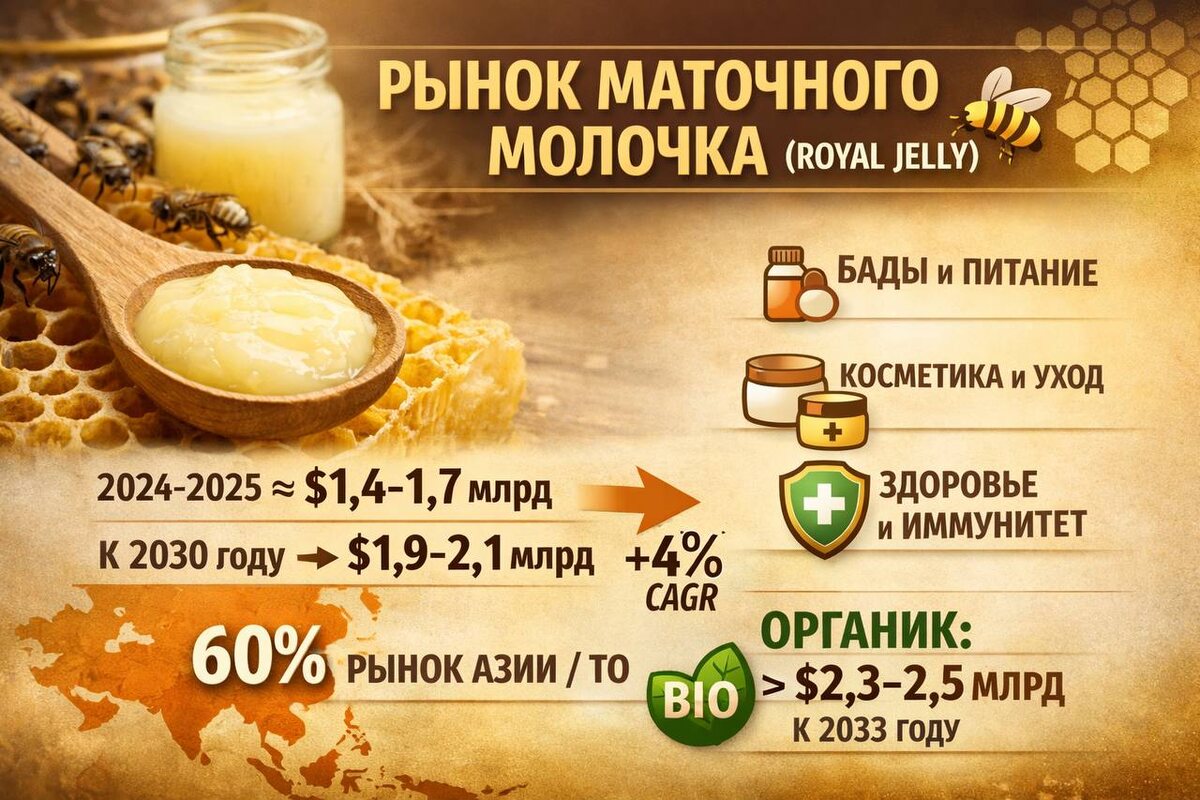 косметики. По оценкам отраслевых аналитиков, в 2024–2025 годах его объём составлял около 1,4–1,7 млрд долларов, а к 2030 году может вырасти до 1,9–2,1 млрд долларов при среднем годовом росте порядка 4 %. Ключевой драйвер — расширение применения: маточное молочко активно используется в БАДах и функциональном питании, в косметике и средствах ухода, а также в продуктах, позиционируемых для поддержки иммунитета и восстановления. Наибольшие объёмы производства и потребления приходятся на Азиатско-Тихоокеанский регион, который обеспечивает более 60 % мирового рынка, прежде всего за счёт Китая и Японии. Отдельно аналитики выделяют сегмент органического маточного молочка: по прогнозам, к 2033 году его рыночная стоимость может превысить 2,3–2,5 млрд долларов, фактически удвоившись за счёт спроса на сертифицированные и «чистые» продукты. Всё это подтверждает, что маточное молочко становится стратегически важным продуктом для глобального рынка натуральных биокомпонентов. Блог Сенцова. Новости, с