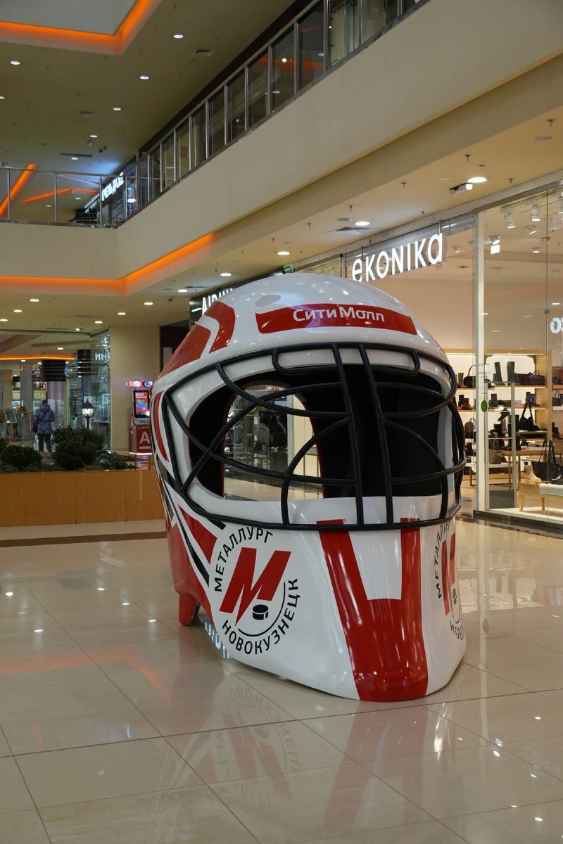Это не просто декорация — это огромный шлем вратаря в стиле экипировки хоккейной команды «Металлург».