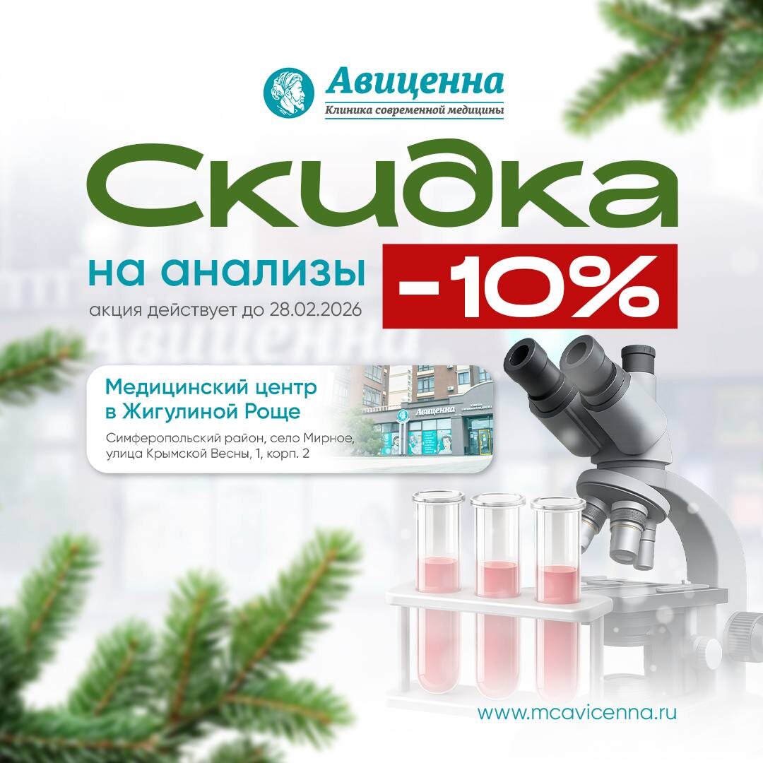 ?💉 Усталость, головные боли, скачки веса, проблемы со сном — мы часто списываем это на стресс и откладываем обследование «на потом». 👉 Но именно анализы помогают выявить проблему до того, как она станет серьёзной. В медицинском центре «Авиценна» в Жигулиной роще мы сделали заботу о здоровье доступнее: ✨ –10% на лабораторные анализы при предварительной записи ✔️ широкий спектр исследований ✔️ точные и достоверные результаты ✔️ комфортно, быстро, без лишних ожиданий 📅 Акция действует до 28.02.2026 📞 +7 (978) 936-76-26 🌐 www.mcavicenna.ru #клиника #авиценна #симферополь
