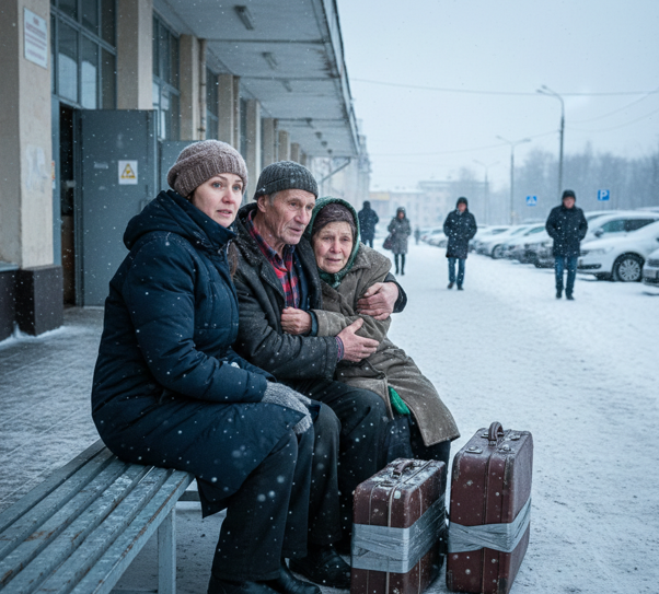 На обледенелой железной скамье сидели двое. Старик в курточке, насквозь пропитанной инеем, и маленькая женщина, закутанная в поношенное пальто. Мужчина обнимал её так крепко, будто пытался врасти в её тело, передать последнее тепло. У женщины на щеках застыли настоящие ледяные дорожки — слезы замерзли прямо на лету.