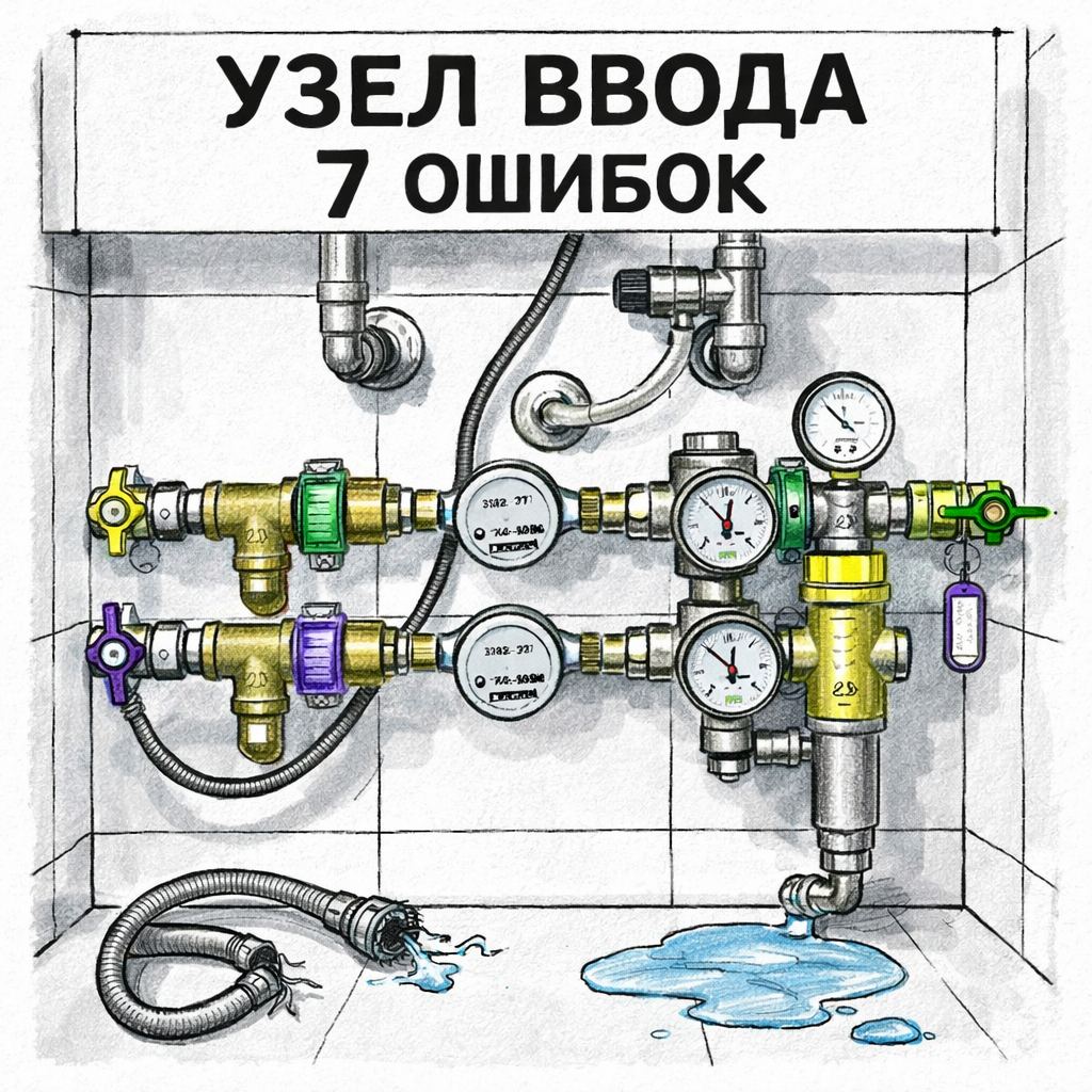 Вторая: «Всё же новое, как оно могло потечь?» Чаще всего это не “ерунда” и не “невезение”. Гибкая подводка, смеситель, стиралка и бойлер — это слабое звено. А вот почему оно рвётся — почти всегда видно в узле ввода воды: где вода заходит в квартиру и дальше раздаётся по точкам. Ниже — 7 мелочей, которые стоят копейки на фоне ремонта, но регулярно спасают от потопа и лишних трат. Проблема: всё красиво зашили, приборы стоят плотной стенкой, фильтр не выкрутить, кран перекрытия рукой не достать. В итоге обслуживание откладывают, а авария случается “вдруг”. Как должно быть по-умному: любой элемент, который нужно крутить/снимать, должен иметь место под ключ и под руку. Это особенно критично для фильтров и редуктора. Даже в выпущенных материалах проекта отдельно отмечено: экономить можно на “косметике” люков, но не на самом доступе к узлам. Проблема: после отключений