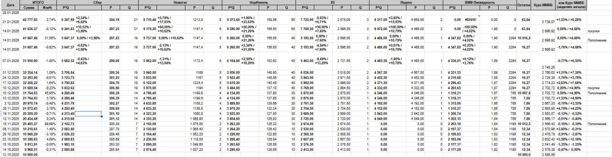 Салют, инвесторы! 👋 Сегодня 21 января 2026 года. Помнишь, неделю назад мы видели «красный» рынок и говорили, что это возможность? Мы были правы. Пока многие паниковали, мы спокойно пополнили счет на 10к, продали защитный фонд (ВИМ-Ликвидность) под ноль и на всю «котлету» закупились акциями. Результат? Мы обогнали рынок почти в 2 раза! 😎 📊 Сухие цифры: 💼 Стоимость портфеля: 42 777,83 руб. 📈 Рост за неделю: +2,74% (Для сравнения: Индекс ММВБ вырос всего на 1,53%). Почему взлетели? Разбор полетов: 1. 🔥 Новатэк (+5,79%): Ракета недели! Зима в этом году суровая, запасы газа в хранилищах тают, а цены в Азии растут. Новатэк на этом фоне чувствует себя королем. Мы вовремя добрали его на просадке! 2. 📱 Яндекс (+3,85%): Технологии снова в моде. На рынке прошел слух о крутом квартальном отчете и новых фичах в их нейросетях. Инвесторы любят будущее, а Яндекс — это оно и есть. 3. 🏦 Сбер (+2,34%): "Зеленый слон" уверенно топает вверх. Хорошая отчетность банковского сектора толкает кот