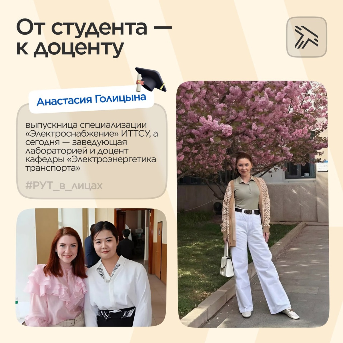 ➡️В дайджесте «В движении» РУТ поделилась своей историей Анастасия Голицына ✔️, выпускница специализации «Электроснабжение», а сегодня — заведующая лабораторией и доцент кафедры «Электроэнергетика транспорта»: 🔵Как вы пришли в аспирантуру? Работа на кафедре со 2 курса, захотелось продолжить, но уже в качестве преподавателя. Решающим фактором стала специальность, по которой я получила диплом специалитета, это «Электроснабжение», захотелось углубиться именно в специальность, которая нравится и уже были базовые знания. 🔵Что вас вдохновляет в вашей деятельности сейчас? Меня вдохновляют коллеги, каждый со своим кругом интересов, в том числе в профессиональной сфере. Всегда понимаешь, что есть к чему стремиться. По роду своей деятельности ты ты по постоянно узнаешь что-то новое, совершенствуешься и это здорово. 🔵Какой совет вы бы дали себе, когда только начинали свой профессиональный путь? Поменьше переживать, побольше верить в себя. Будь в курсе событий РУТ