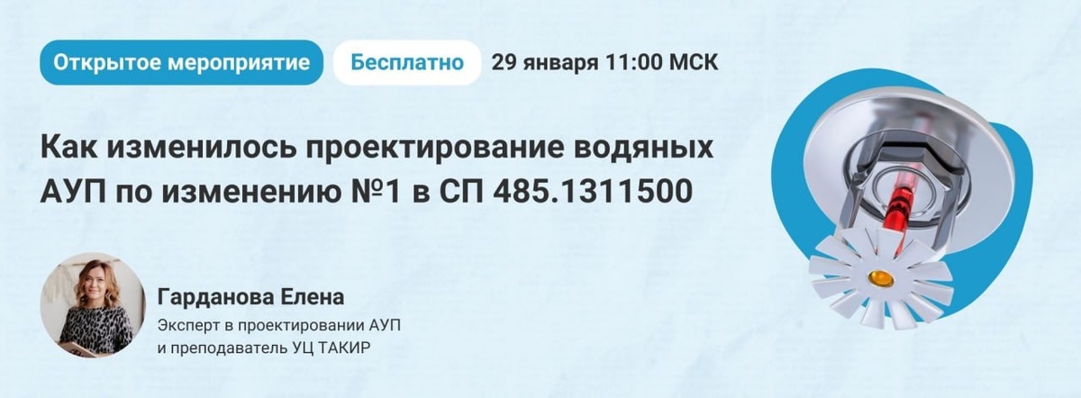 📣 Как изменилось проектирование водяных АУП по изменению №1 в СП 485.1311500 С 1 января 2026 года вступило в силу изменение №1 к СП 485.1311500. На вебинаре разберем, как это повлияет на проектирование водяного АУП и на что стоит обратить особое внимание. 🎙 Спикер: эксперт в проектировании АУП и преподаватель УЦ ТАКИР – Гарданова Елена. Программа вебинара: 1⃣ Новые термины и определения. 2⃣ Изменение требований: к оросителям и их монтажу; к трубопроводам, их окраске и уклонам; к насосам и насосным станциям. 3⃣ Запрет на применение СПЖ взамен УУ. 4⃣ АУП-ТРВ и АУП-ПП только по согласованным СТО. 5⃣ Уточнение требований к патрубкам для передвижной пожарной техники. 6⃣ Уточнение требований к ВПВ совмещенному с АУП. 📍Дата: 29 января в 11:00 (МСК) Участие бесплатное по предварительной регистрации 🔗 Зарегистрироваться на вебинар (https://clck.ru/3RNbm3) Пишите свои вопросы Елене в комментариях ✏