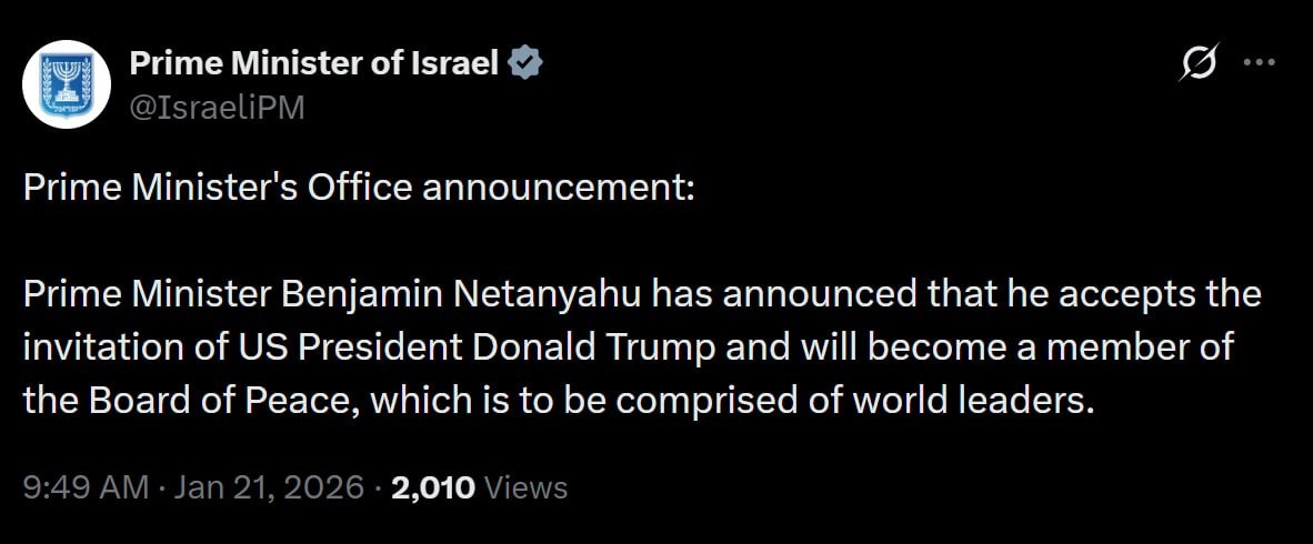 Премьер-министр Израиля Биньямин Нетаньяху подтвердил согласие присоединиться к «Совету мира», создаваемому по инициативе президента США