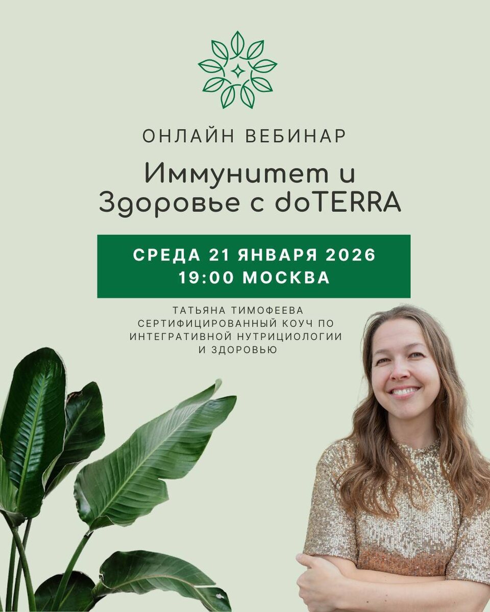 🌿 Иммунитет и здоровье с doTERRA 📅 Среда, 21 января 2026 ⏰ 19:00 Москва 📍 Онлайн, Zoom Приглашаю вас на практический вебинар, где мы поговорим о том, как поддерживать иммунитет и здоровье всей семьи с помощью натуральных решений doTERRA. На встрече разберём: ✨ как работает иммунная система ✨ базовые ежедневные привычки для поддержки здоровья ✨ эфирные масла и продукты doTERRA для работы с воспалениями, стрессом, сном и во время сезона простуд ✨ как выстроить простую и эффективную wellness-рутину 🎓 Спикер: Татьяна Тимофеева сертифицированный коуч по интегративной нутрициологии и здоровью, doTERRA Presidential Diamond Приходите, вебинар абсолютно бесплатный 🤍 здоровье начинается с осознанности 🌿 Пишите, если хотите присоединиться, я вышлю ссылку 🔗