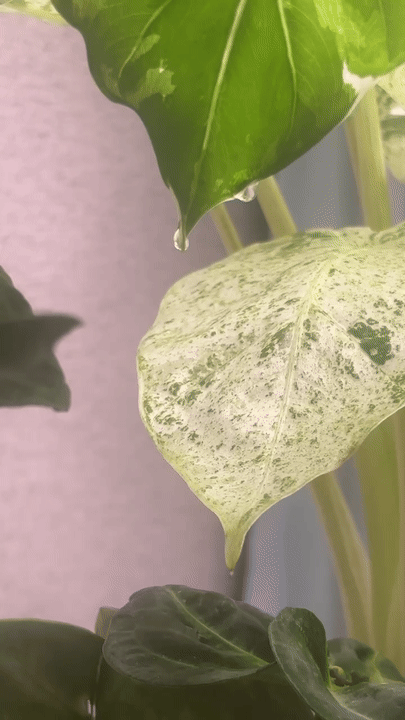 Ночью в спальне у меня начинается дождь — капли с листьев Регал Шилдс, Корталси, Одоры и Окинавы Сильвер. Это не болезнь, а гутация — естественный процесс. Почему мои алоказии капают, и что с этим делать? Рассказываю! Так вот, ночь, тишина… и вдруг — кап-кап-кап. Я сижу в спальне, пытаюсь понять, что происходит, и начинаю паниковать, бужу мужа с тревогой и паникой. В голове: «Батарея течёт», «Потолок протекает», «У соседей лопнула труба». Так было несколько ночей подряд, я паниковала, но ничего не делала. Но на самом деле это не поломка в системе отопления и не дождь из потолка, а просто гутация — естественный процесс у здоровых крупных алоказий. Да, именно так! И я решила разобраться, что с этим делать, почему это происходит и что вообще происходит с моими растениями. Гутация — это когда растение выводит лишнюю воду через специальные отверстия на листьях, называемые гидатодами. У ароидных (таких как алоказии, филодендроны, монстеры) это довольно обычное явление, особенно ночью. Почему