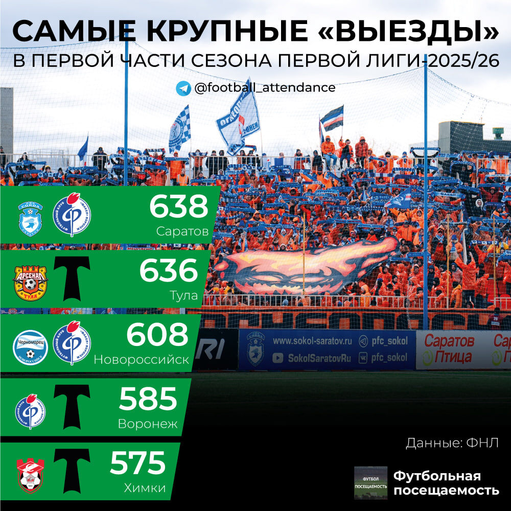 16 ноября 2025 г. его организовали болельщики воронежского «Факела» на игру 19-го тура против саратовского «Сокола». При суммарной посещаемости матча в 3035 зрителей фанаты «Факела» составили 21% от всей аудитории на стадионе. Немногим меньше, по официальным данным протокола матча, было фанатов «Торпедо» в гостях в Туле 11 октября — 636 человек. На третьем месте — путешествие «факелонов» в Новороссийск (608). Отмечу один нюанс, что на 5-й позиции «выезд» торпедовцев был, по сути, на домашний стадион, но на гостевую по протоколу встречу с костромским «Спартаком». В топ-6 самых многочисленных выездов только фанаты «Факела» и «Торпедо». На 7-й позиции лучший выезд «Ротора» также в Саратов (560 человек), на 8-й — выезд костромского «Спартака» в Ярославль (493). Пишите комментарии, если вам интересна тематика выездных матчей — сделаю полную статистику по всем выездам этого сезона! Не забывайте подписаться на канал здесь на Дзен и в Телеграм! Также вы можете отблагодарить мою работу донатами