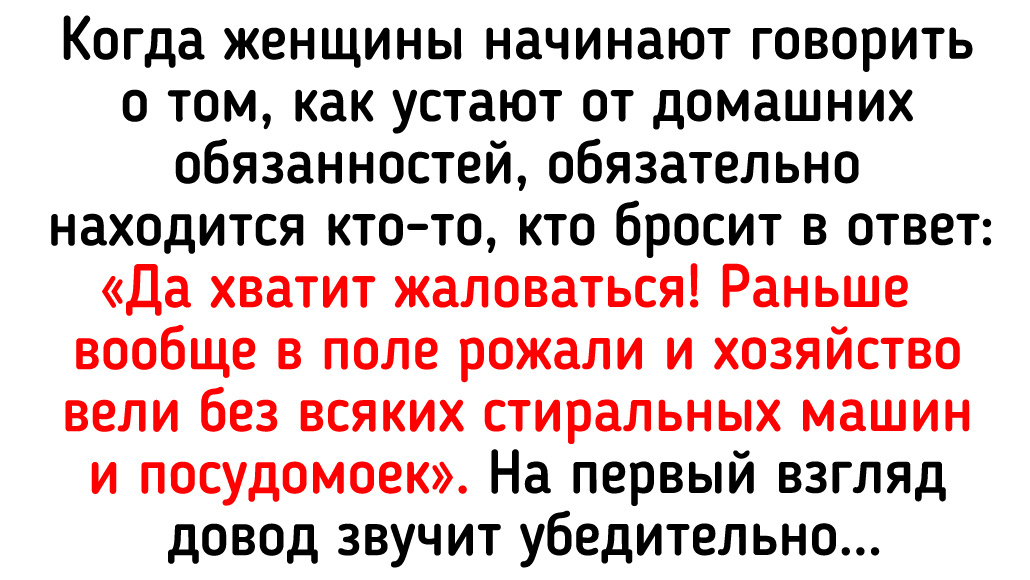 Когда женщины начинают говорить о том, как устают от домашних обязанностей, обязательно находится кто-то, кто бросит в ответ: «Да хватит жаловаться! Раньше вообще в поле рожали и хозяйство вели без всяких стиральных машин и посудомоек». На первый взгляд довод звучит убедительно, но сути дела это не меняет: даже при всех достижениях цивилизации женщины продолжают уставать. Как, впрочем, и мужчины, если они берут на себя часть быта.