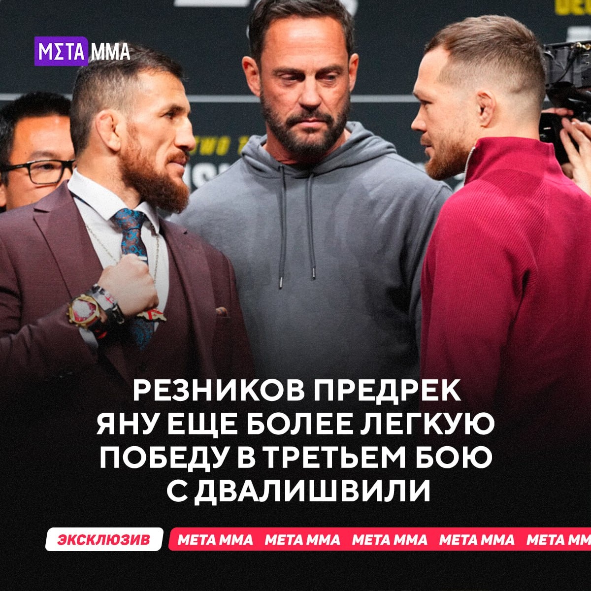 Боец ACA Артём Резников считает, что в случае третьего поединка Пётр Ян одержит над Мерабом Двалишвили ещё более уверенную победу. Он провёл параллель с противостоянием Леона Эдвардса и Камару Усмана. «Петр сейчас будет более уверенным. Скажу так: был бой Камару Усмана против Леона Эдвардса, где Леон проиграл четыре раунда и в пятом нокаутировал. В реванше Эдвардс выиграл уверенно, потому что почувствовал, что может. У Петра с Мерабом такая же ситуация, и, скорее всего, если они встретятся, победа будет еще легче», – сказал Резников в интервью MMA.Metaratings.ru ❓ Согласны с таким прогнозом? 🔥 — Ян заберёт третий бой без вопросов 🤔 — Двалишвили способен адаптироваться 👊 Подпишись на Meta MMA | Meta MMA в MAX | Наш канал в ВК
