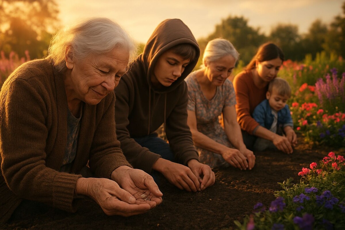 Рядом раздался шорох. Она подняла глаза. Рядом с ней, не сговариваясь, встали на колени другие. Подросток, бабушка Антонина, молодая мама с дочкой. Каждый взял по семечку из её протянутой ладони и посадил его в мягкую, тёплую землю.