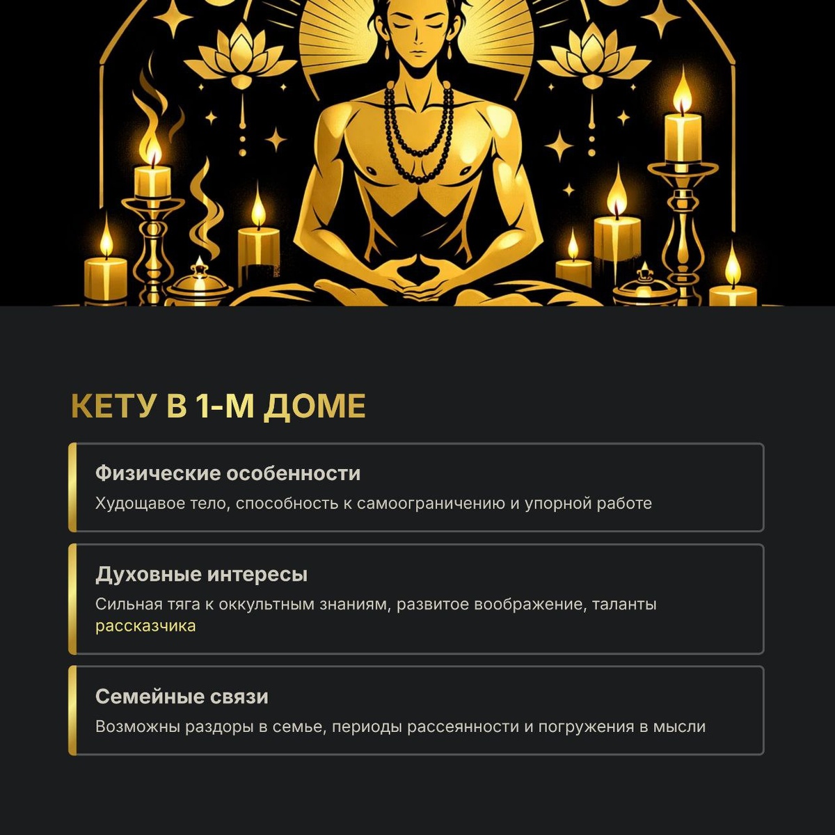 🌌 Это положение создает уникальную и глубокую личность, чья сущность отмечена печатью прошлого опыта и духовных поисков. Вы несете в себе ауру тайны, отрешенности и необычных способностей. 🔸 Внешность и характер: 🔸 Особенная стать: Часто это указывает на худощавое, аскетичное телосложение и проницательный, отстраненный взгляд. 🔸 Железная воля: Вы обладаете удивительной способностью к самоограничению и упорному труду ради высшей, часто неочевидной для других, цели. 🔸 Внутренний мир и вызовы: 🔸 Духовный искатель: Ваш ум сильно увлечен духовными, мистическими или оккультными вопросами. Вам интересно то, что находится за гранью обычной реальности. 🔸 Богатое воображение: Вы живете в мире пылкого воображения, что может приводить к рассеянности в повседневных делах, но и дарует способности к сочинительству или рассказыванию невероятных историй. 🧚 🔸 Испытания в семье: Вы можете переживать периоды семейных раздоров или чувствовать себя «белой вороной» в родном окружении, что по