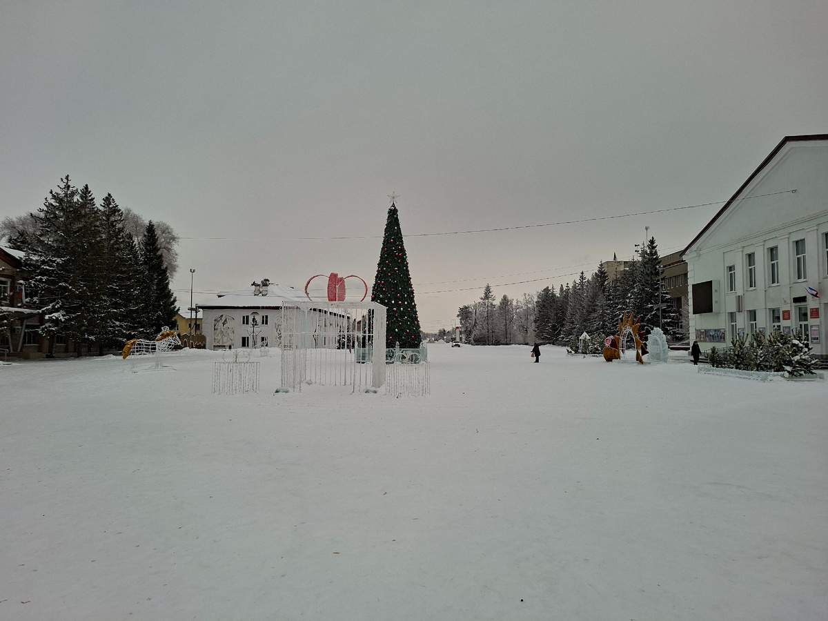 Это площадь Мира. Вездесущего В.И. Ленина на этой площади нет, он украшает «провинциальную» площадь у администрации района на северной стороне. Зато на площади Мира имеется главная городская елка.