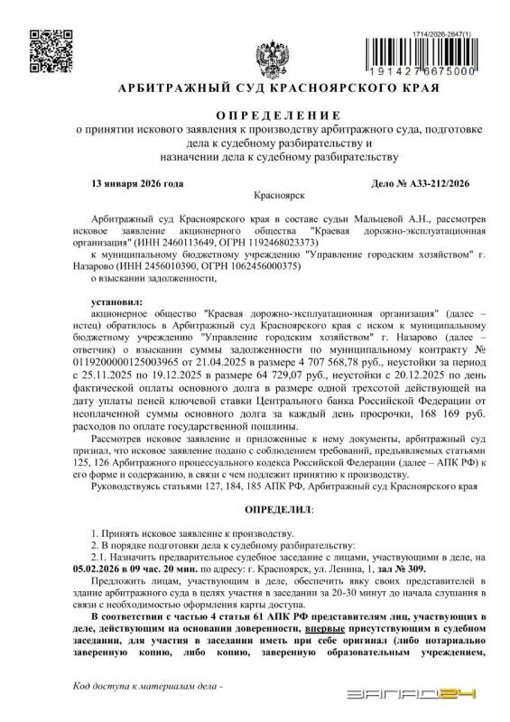 Акционерное общество «КРАЙДЭО» обратилось в Арбитражный суд Красноярского края с иском к МБУ «Управление городским хозяйством» города Назарово о взыскании суммы задолженности по прошлогоднему муниципальному контракту на ремонт дорог в городе стоимостью 100 млн рублей. Предварительное судебное заседание назначено на 5 февраля 2026 года. В апреле прошлого года «КРАЙДЭО» выиграло самый дорогостоящий аукцион на ремонт восьми участков дорог в городе Назарово: АЗС «Кемпинг»-мкр. Бор; ул. Школьная; ул. Советская; ул. Островского; ул. Озерная; ул. Кравченко от ул. Березовая роща до ул. Кооперативная; ул. Арбузова (проезд между ж/домами № 92 и № 94) и а/д ул. Заводская. Однако 1 ноября в связи с выявленным несоответствием качества части работ, а именно участка дороги протяженностью 178,5 м по улице Заводская, контракт с подрядчиком был расторгнут по соглашению сторон. В прошлом году подрядчика, а фактически ремонтом дорог в городе Назарово занималось «Ачинское ДРСУ», учредителем которого и