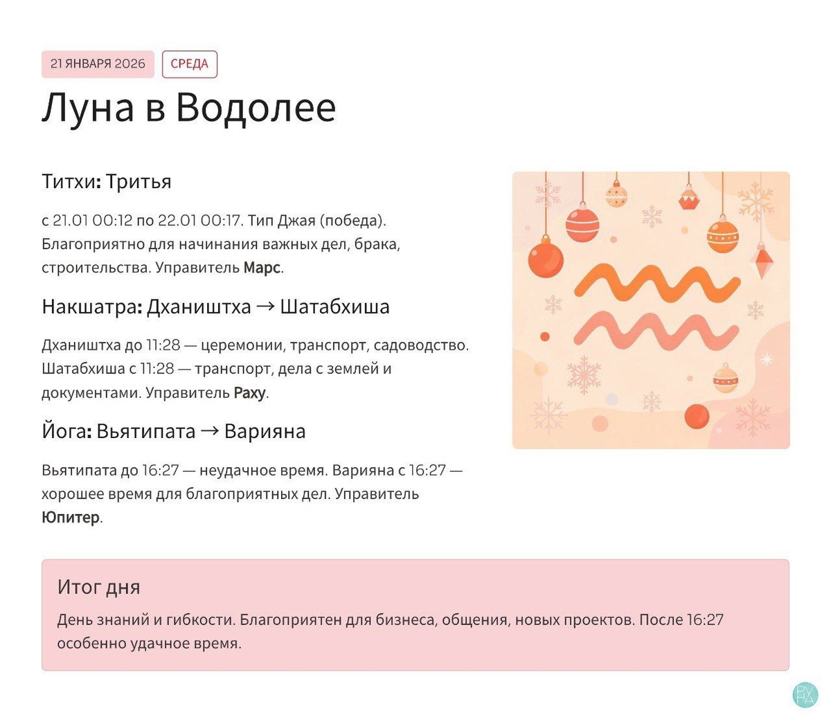 Среда. День Меркурия, но сам Будха сейчас в самом сердце пламени. Он в точном соединении с Солнцем в Козероге, полностью «сожжён» его сиянием. Это не ошибка карты, а алхимический процесс. Планетная война (граха-юддха) здесь - это битва за кристальную ясность. Уже 23 января Меркурий выйдет из этого испытания обновлённым, как феникс. Но сегодня его свет скрыт. Вы можете ощущать это как туман в мыслях, слова, которые не попадают в цель, или идеи, ускользающие, как вода. В делах, связанных с документами, общением и логикой, будьте особенно внимательны. Рядом - Марс и Венера. Этот союз создаёт уникальное пространство для дипломатии, где страсть может найти изящное выражение, а переговоры - привести к хрупкому, но ценному миру. Луна утром ещё в Дхаништхе, поддерживает лёгкость, но после 11:28 она делает шаг в таинственную Шатабхишадж - накшатру целителей и звёздных врат, где её ждёт встреча с Раху. Эмоциональный фон может смениться: от открытости - к внутренней тревоге, желанию всё конт
