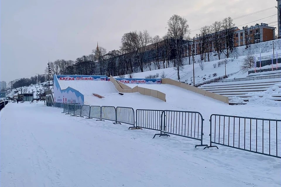 На нижней набережной Камы в Перми открылась бесплатная площадка «Катай по-дикому» для сноубордистов и лыжников! У амфитеатра построили два