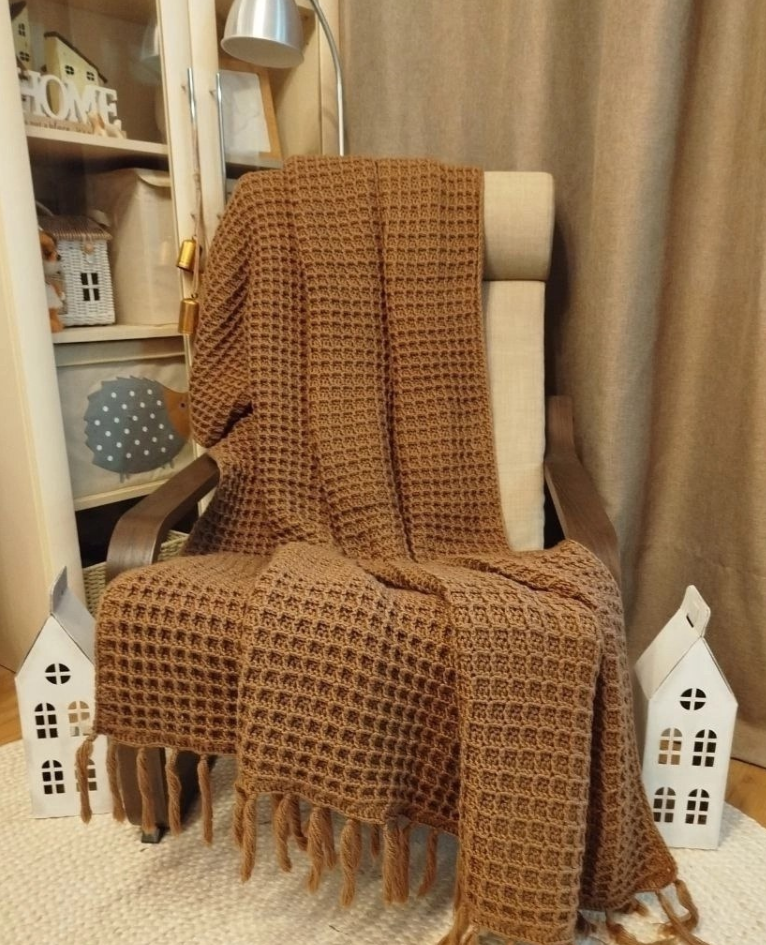Представьте уютный вечер дома, когда мягкий свет лампы, чашка чая в руках и тёплый плед, окутывающий вас словно объятия. Особое очарование этому моменту придаёт вязаный плед с рисунком "вафелька", на первый взгляд простой, но невероятно стильный. Именно такой плед изображён на главном фото, его тёплый коричневый оттенок, фактурный узор и изящная бахрома создают ощущение домашнего уюта и тепла. Таким простым рисунком можно вязать пледы как большие, так и детские и причем в разной цветовой гамме. Рисунок "вафелька"- это не просто эстетика, а продуманное решение для вязаного пледа. Его простота заключается в чёткой геометрической структуре. Переплетающиеся столбики формируют рельефные квадраты, напоминающие ячейки вафельницы.