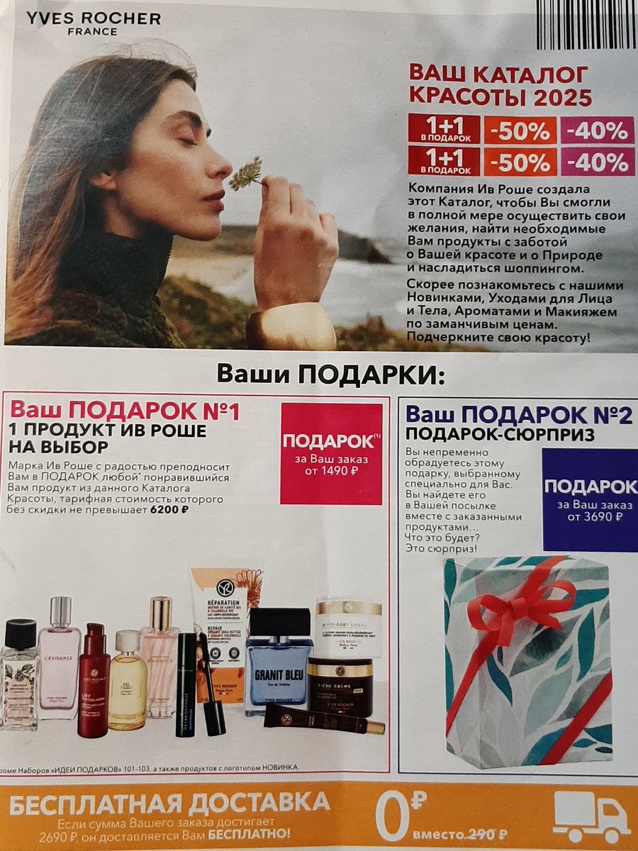 Всем привет! Недавно мне пришел третий заказ по каталогу и бланку Ноября 2025 , о котором писала тут: Вместе с заказом в коробке был каталог 9РИО2АС01. Это действующий полугодовой бланк. Как долго он будет работать и когда закончится его действие информации у меня нет. Но буквально вчера, через оператора я сделала по данному бланку небольшой заказ. Бланк пришел мне очень помятый, еле его разгладила и выпрямила. Поэтому заранее прошу не судить строго за качество фото. Применяла сканер в телефоне, для того что бы текст было видно лучше, но пострадало изображение. Минимальная сумма заказа по данному бланку 1490 р. Первый подарок можно взять любой продукт из каталога, цена на который не превышает 6200 р , кроме наборов , идей подарков со стр 101-103 и продуктов с логотипом Новинка. По сравнению с каталогом Января https://dzen.ru/a/aViWjaReTmfDjC85?share_to=link, где первый подарок можно взять на сумму до 2650 р., этот бланк получается более менее выгодным. Цены на продукцию +/- одинако