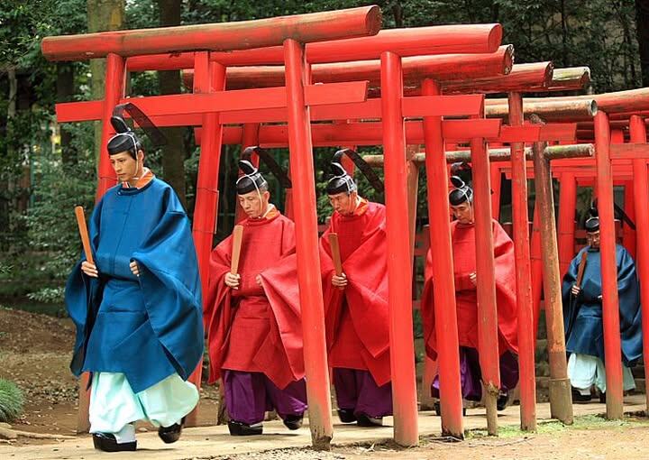 Кто жрец? Наследственные или назначенные каннуси (жрецы в белых и зелёных одеждах) и их помощницы мико (девушки в красных хакама, часто выполняющие ритуальные танцы кагура).