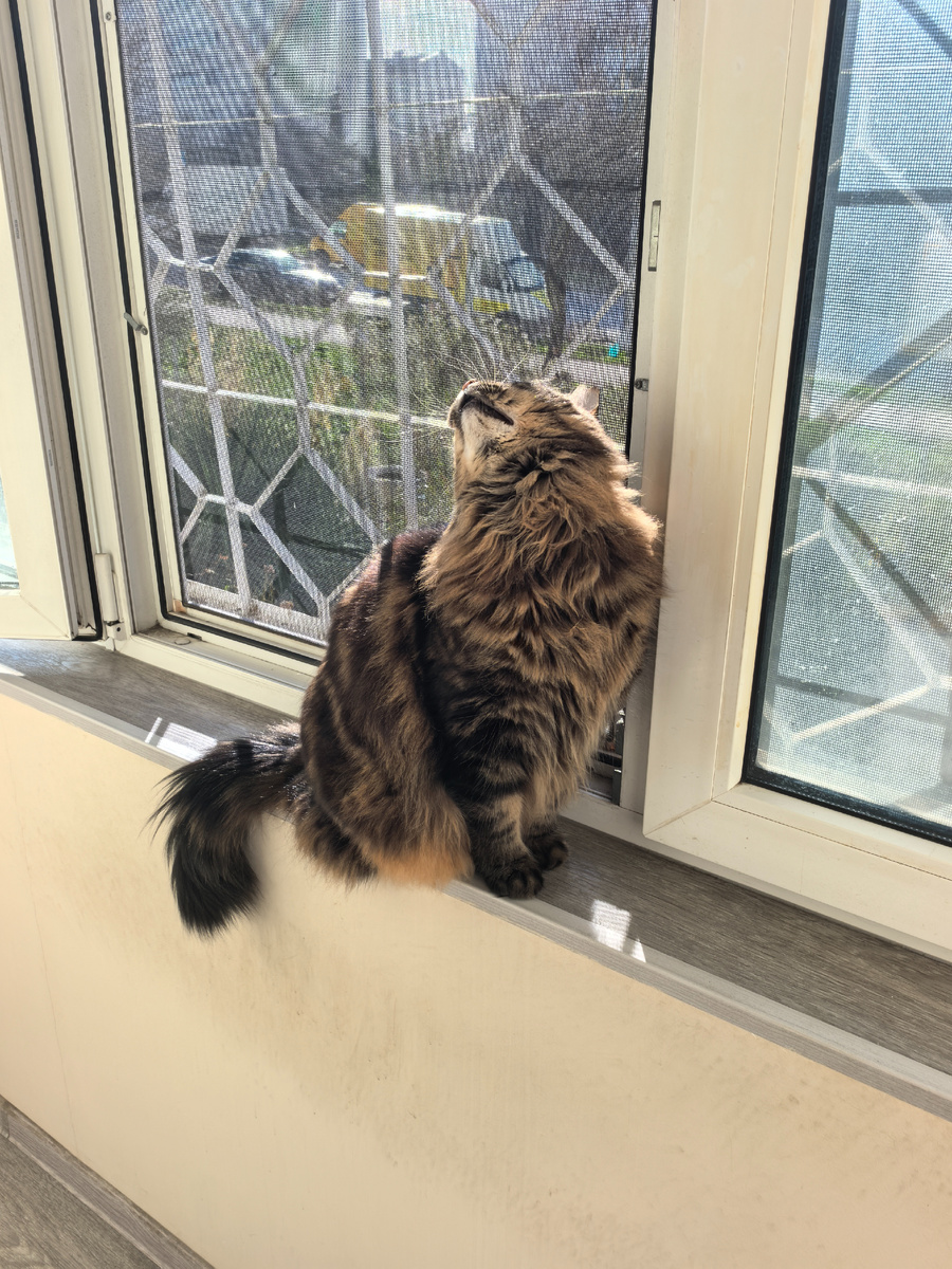 Вернулась хозяйка, открыла дверь на балкон, пошёл там сидеть.