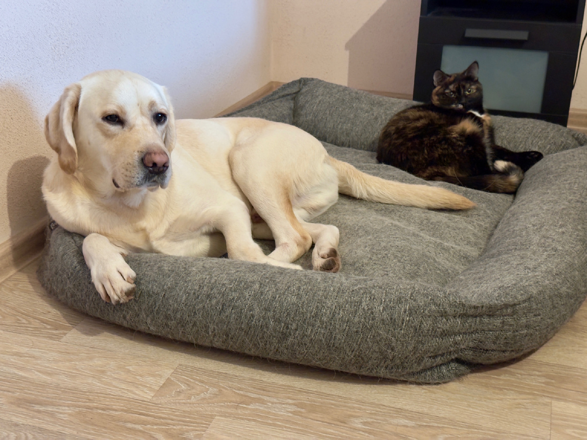 Помните наши истории о том, как кошки самоуправно занимают собачьи лежанки, а Оскару и Джонни приходится ютиться рядышком на полу? А вот недавно случился обратный сценарий!