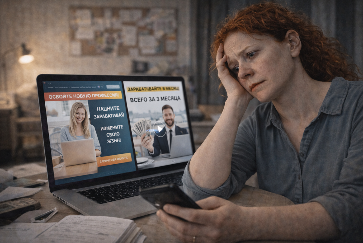 Реклама попалась случайно. Я листала ленту поздно вечером, когда усталость уже смешивается с раздражением и кажется, что вся жизнь проходит мимо. Красивые слова, уверенный тон, чужие истории успеха: “освоите новую профессию”, “начнёте зарабатывать”, “измените жизнь за несколько месяцев”. Всё выглядело аккуратно и убедительно. Не крикливо - именно поэтому и подкупало. Я давно чувствовала, что застряла. Работа была стабильной, но пустой. Деньги - ровно чтобы жить, но не чтобы чувствовать. Мне хотелось верить, что дело не во мне, а в том, что я просто не на своём месте. Курсы казались шансом. Созвон был быстрым. Девушка говорила уверенно, но мягко. Задавала вопросы, кивала, будто видела меня насквозь. - У вас хороший потенциал. - Вы быстро войдёте в профессию. - Главное - вовлечённость. Про деньги она сказала вскользь: - Окупается очень быстро. Я заплатила. Не последние, но ощутимые. Первые недели были воодушевляющими. Видеоуроки, чат, новые слова, ощущение, что ты наконец-то “в процессе”