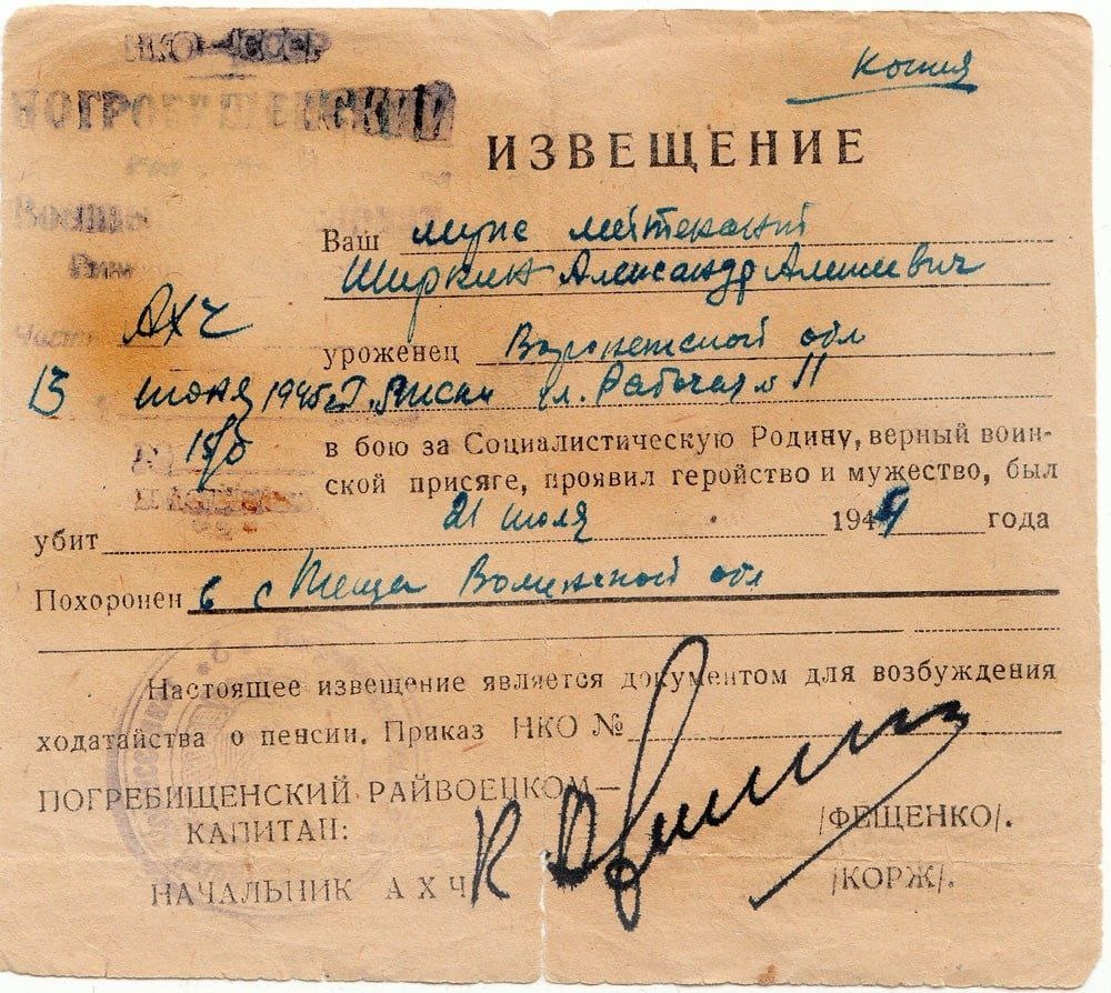 ) Извещение по форме №4, известное как «похоронка», стало одним из самых трагических документов Великой Отечественной войны. Оно уведомляло семьи о гибели их близких на фронте. Этот документ вызывал страх у каждого, кто ждал вестей от родных, находящихся на передовой. Процесс оформления извещения был строгим. Штаб части, где служил погибший, направлял документ в военкомат по месту призыва. Там создавался дубликат для передачи родственникам и оформления пенсии. Оригиналы оставались в архиве военкомата. В первые месяцы войны извещения приходили в виде треугольных писем, написанных на обычных листах бумаги. Их сложно было отличить от фронтовых писем, что усиливало тревогу. Почтальоны нередко отказывались разносить такие письма из-за эмоциональной нагрузки. Позже похоронки начали отправлять в официальных конвертах.