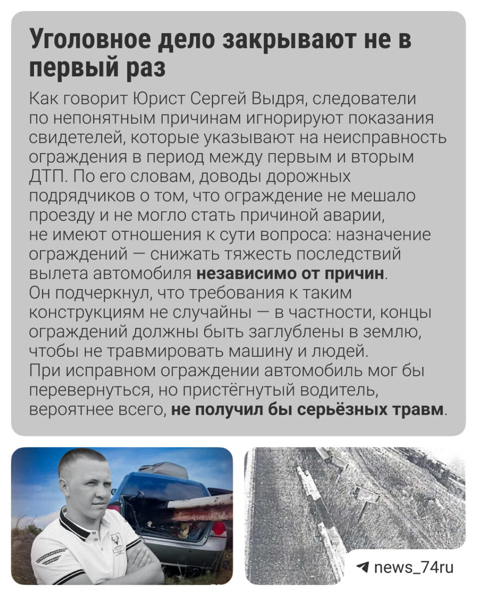 Дорожники выплатят два миллиона рублей за смертельное ДТП, в котором погиб водитель Honda Civic. Но уголовное дело прекратили Областной суд вынес решение по гражданскому иску в связи с ДТП на трассе Степное — Троицк, в котором погиб Павел Стяжкин. Подрядчик, компания «Урал-Сервис-Групп», выплатит компенсацию морального вреда отцу погибшего. 🟥 Предыстория. Авария произошла 24 июля 2021 года. Honda Civic вылетела с дороги Степное — Троицк и напоролась на рельс безопасности, который был повреждён в другой аварии за месяц до этого. Изначально виновным в происшествии признали погибшего, и уголовное дело по статье 264 УК РФ закрыли в связи со смертью водителя. Однако его отец Сергей Стяжкин все эти годы пытается доказать причастность сотрудников дорожных компаний «Ойкумена» и «Урал-Сервис-Групп» к гибели сына. Несмотря на победу в областном суде, Сергей Стяжкин не удовлетворён ходом дела. По его словам, иск подавался, скорее, от отчаяния, ведь дорожников не удавалось привлечь к уголовно