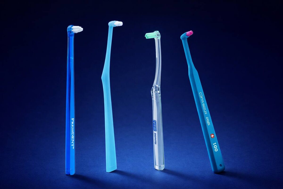 1. Curaprox CS 1006 / 1009 Single — швейцарская монопучковая щётка с очень тонкими щетинками, мягко и эффективно очищает труднодоступные места, особенно у линии десны и вокруг ортодонтических конструкций.