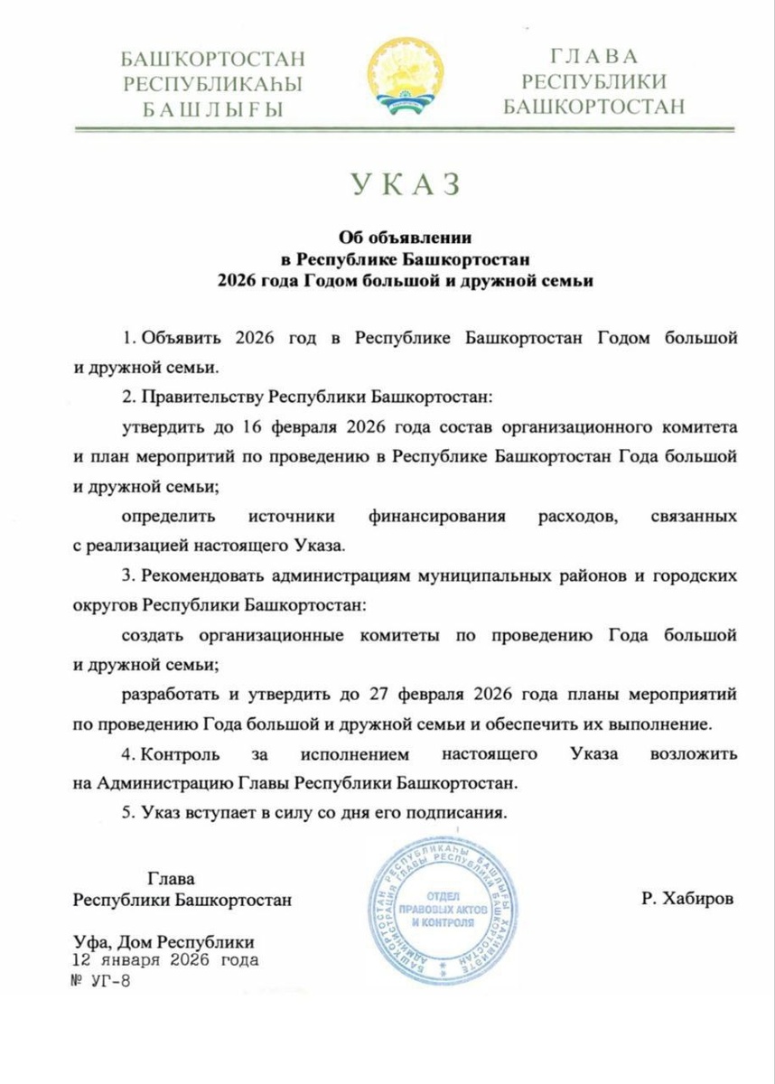 Указом главы Башкортостана 2026 год объявлен Годом большой и дружной семьи