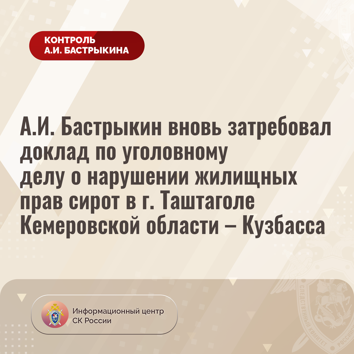 А.И. Бастрыкин вновь затребовал доклад по уголовному делу о нарушении жилищных прав сирот в г. Таштаголе