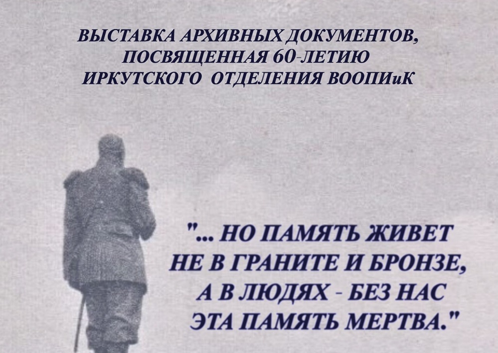 В Центре документации новейшей истории - филиала Государственного архива Иркутской области открывается выставка архивных документов «…Но память живет не в граните и бронзе, а в людях без нас эта память мертва». Выставка посвящена 60-летию Иркутского регионального отделения всероссийского общества охраны памятников культуры и истории (ВООПИК). Иркутское отделение Всероссийского общества охраны памятников культуры и истории было основано 17 января 1966 года и долгие годы было одно из самых заметных в стране. В числе его руководителей и активистов разных лет – Николай Салацкий, Надежда Полунина, Светлана Утмелидзе, Владимир Китаев. В настоящее время его возглавляет Алексей Чертилов. На выставке представлен комплекс архивных документов, рассказывающих о становлении Иркутской областной организации ВООПИК, ее руководителях и активных членах, а также о процессе сохранения региональных памятников истории и культуры, как ледокол «Ангара», Казанская Церковь иконы Божией Матери и других. Выставка