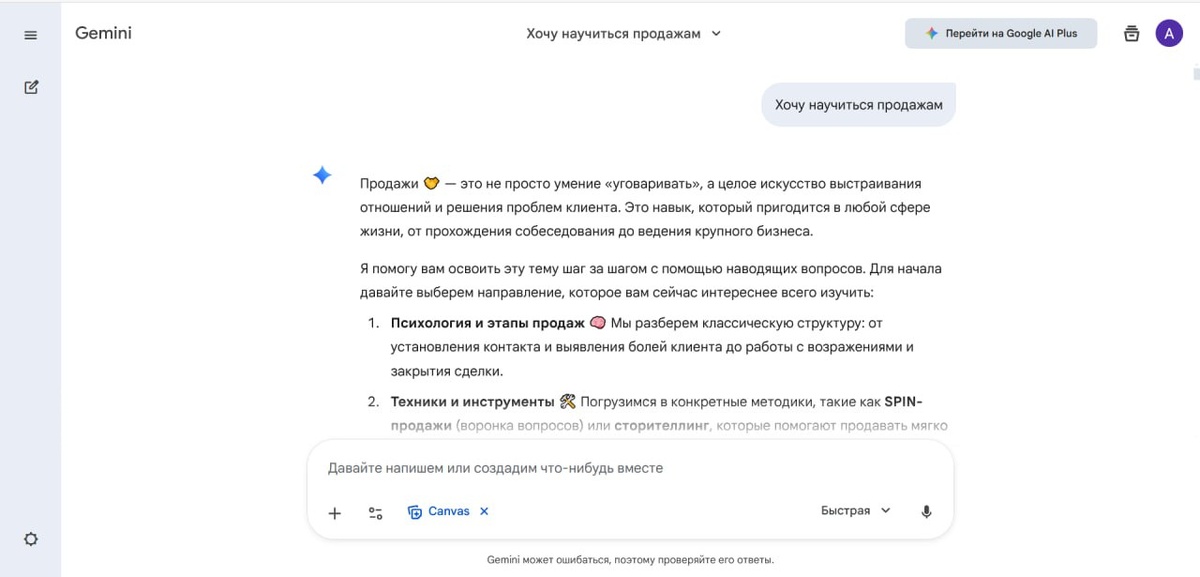 Google добавил режим обучения в свой ИИ-чат Gemini. Давайте разберемся, как он работает и что из себя представляет. Как запустить? Всё просто: заходим в Gemini и в нижнем меню выбираем соответствующий режим. Затем говорим ИИ, чему хотим научиться, и при необходимости загружаем файлы (учебники, стандарты), на которые он будет ориентироваться. Что умеет? 1. Составляет программу обучения — предлагает гибкий выбор темы и перестраивает материал под уровень ученика. - Круто звучит? Очень круто. - Хорошо ли это работает? Нет. o В начале мы получаем базовое описание темы, которой я хочу научиться. Потом ИИ дает мне 3 темы на выбор, с чего бы я хотел начать. При этом зачастую начать с начала нельзя. o ИИ не оценивает текущие знания. Было бы логично спросить пользователя о его уровне и, при необходимости, проверить его вопросами или тестом. o Темы часто идут не по порядку, ключевые части пропускаются. Например, в технике продаж мы поверхностно прошли «выявление потребностей» (меньше стра