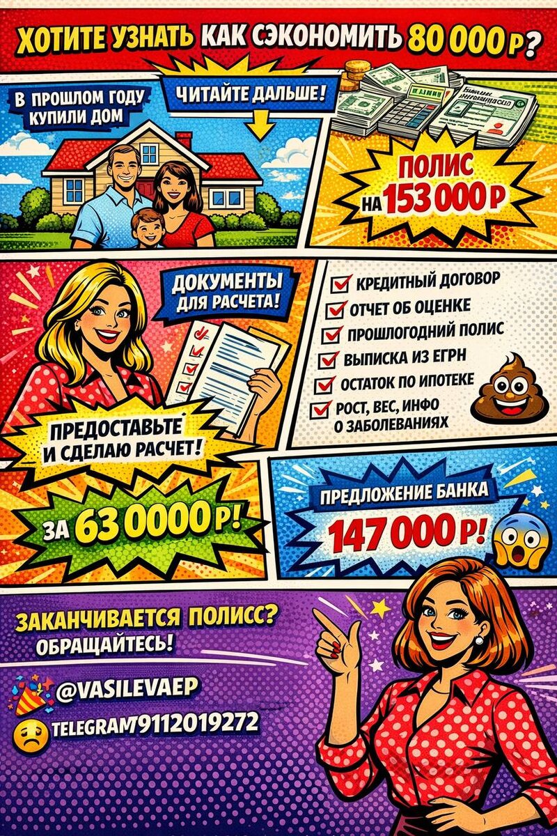Хотите узнать как человек съэкономил 80 тыс руб на страховом полисе, тогда скорее читайте 👇 Обратился ко мне клиент для расчета стоимости ипотечного полиса. В прошлом году они с семьей приобрели прекрасный дом 🏡 В банке при оформлении им сделали полис страхования имущества (дома) и страхование жизни заемщика за 153 тыс руб. ❗️В первую очередь давайте проговорим что необходимо предоставить брокеру для правильного расчета стоимости страхового договора при страховании дома 🖌️Кредитный договор 🖌️Отчет об оценке 🖌️Прошлогодний полис 🖌️Выписка из ЕГРН 🖌️Остаток по ипотеке 🖌️Рост, вес, давление, информация про хронические заболевания Этих данных будет достаточно чтобы сделать вам расчет и предоставить информацию. Если страховой агент или брокер не запрашивает у вас эту информацию, то будьте готовы, что после предоставления цена может измениться в несколько раз 😕 Так вот моему клиенту, я нашла вариант за 63 тыс руб. 🤩 Предложение банка на этот год - 147 тыс. 😱 💫Если у вас зак