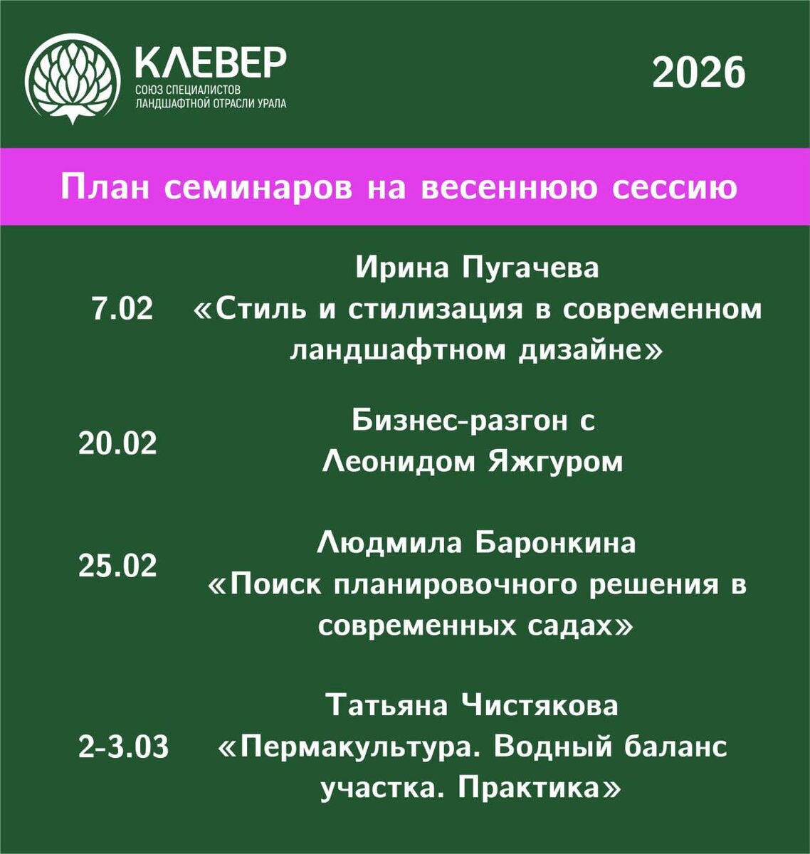 ☀️ Интриганка из меня никакая 🤷♀️ Если я хочу чем-то с вами поделиться, то удержать меня невозможно. 🤭 А я очень, очень, очень хочу Рассказать вам о семинарах, которые пройдут уже совсем скоро. 📝 7 февраля «Стиль и стилизация в современном ландшафтном дизайне» от Ирины Пугачевой 📝 20 февраля Бизнес-разгон с Леонидом Яжгуром 📝 25 февраля «Поиск планировочных решений в современных садах» с Людмилой Баронкиной 📝 2-3 марта «Пермакультура. Водный баланс. Практика» с Татьяной Чистяковой Подписывайся ⬇️ Ставь ❤️ Следи за анонсами 💯 Всех обняла 🤗