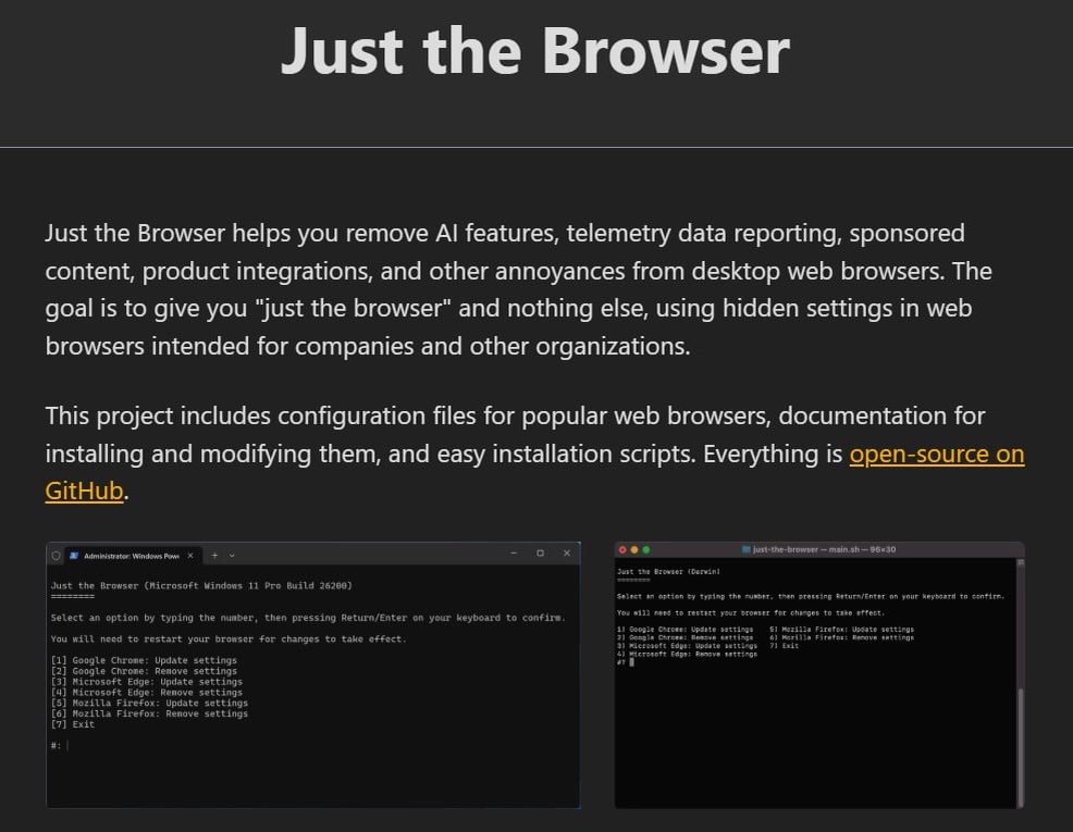 Запущен проект Just the Browser, предназначенный для удаления ненужных элементов из веб-браузеров на ПК. С помощью набора скриптов и конфигурационных файлов можно отключить: • ИИ-функции • Рекламу • Интеграции • Рекомендации и другие элементы Документация по установке доступна для Windows, macOS и Linux. Исходный код Just the Browser открыт и размещён на GitHub. — «Для работы в интернете пользователю нужен только браузер — и ничего больше». https://dzen.ru/id/5c0e38ff46ef5c00aaa80527
