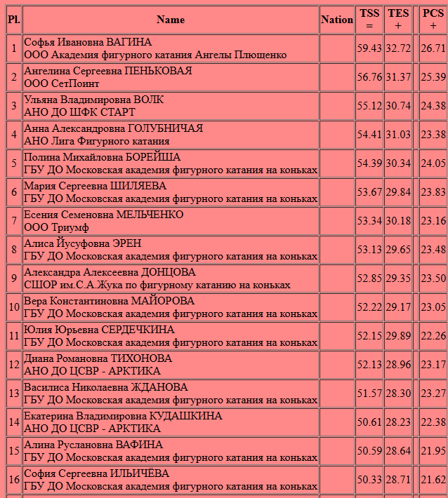 Пропустившая год назад Первенство Москвы Ангелина Пеньковая (56.76 - 2 место) из группы Алексея Василевского подтверждает, что будет здесь одной из главных претенденток на победу. Очень стильная у Ангелины короткая программа, которую я отметил еще в прошлом сезоне. Высокая скорость, интересные и сложные связующие позиции в хореографии, обыгранные через музыкальные акценты композиции группы "Вудкид", уверенное выполнение всех прыжков, максимально креативная дорожка шагов. Прокат без минусов, который заслуженно получил очень высокие оценки от судей.