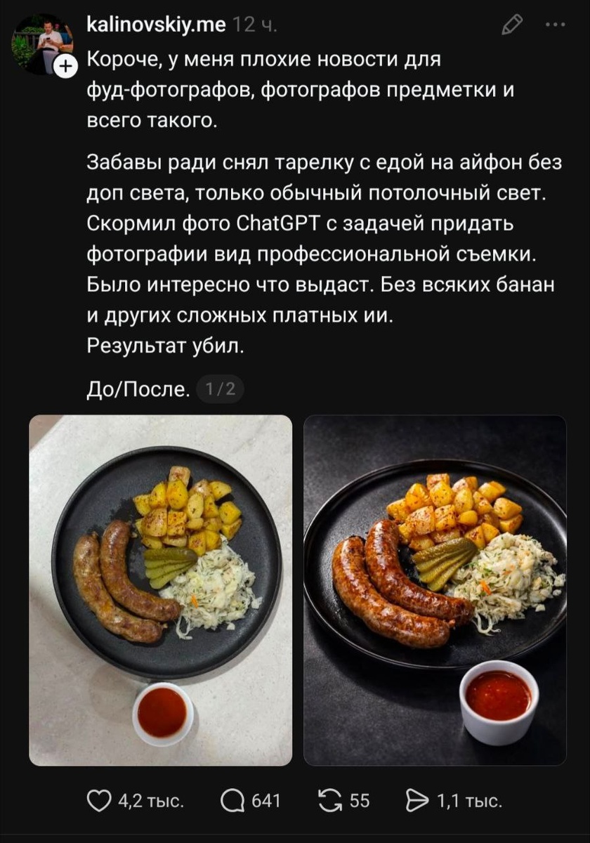 😬 Нейронки теперь спокойно апгрейдят фотки «на тапок» до уровня студийной съёмки с профессиональным светом. Без софтбоксов. Без фотостудии. И даже без модной Banаna Pro. Фуд-фотографы, держимся. Это четвертая (или пятая?) промышленная революция. А сколько работы на предприятиях отменяют нейронки?